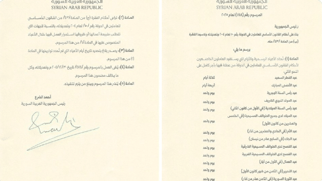 أصدر الرئيس السوري أحمد الشرع مرسوماً جمهورياً جديداً يُنظّم من خلاله قائمة الأعياد الرسمية في البلاد، محدداً الأيام التي تُمنح فيها عطلة مدفوعة الأجر للعاملين الخاضعين لأحكام القانون الأساسي للعاملين في الدولة.