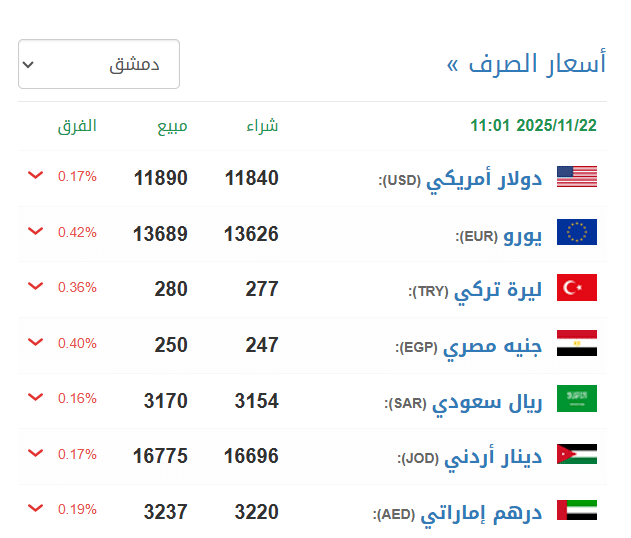 أسعار صرف الليرة السورية مقابل العملات الأجنبية والذهب اليوم السبت 22 نوفمبر 2025